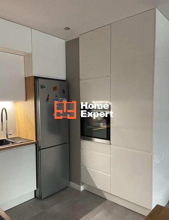 Salon z kuchnią: Wyposażony w nowoczesną zabudowę kuchenną dostosowaną na wymiar oraz wysokiej klasy sprzęt AGD, obejmujący zmywarkę, płytę, piekarnik, lodówkę i okap.