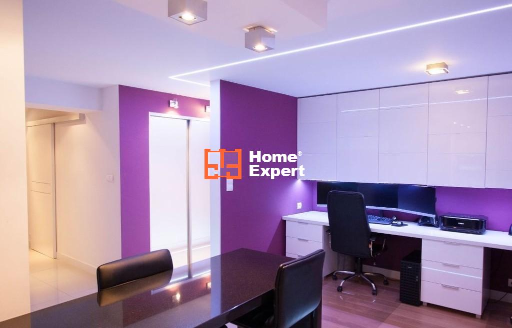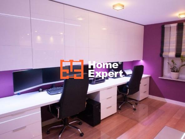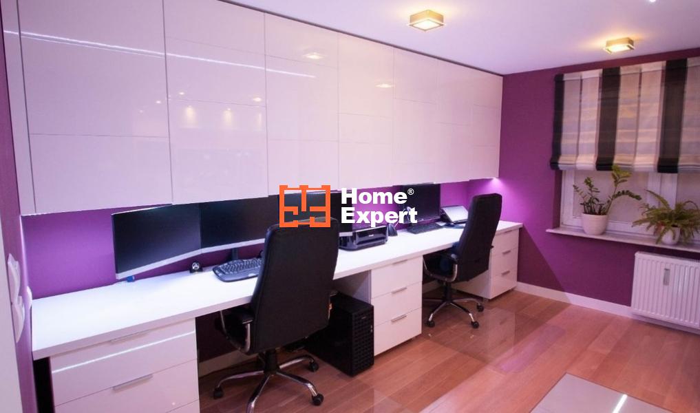 Pomieszczenie biurowe połączone jest z kuchnią. Podłoga: deska, dąb bielony. Duży, 4.5m blat wraz z szufladami, idealny dla osób pracujących z domu. Nad blatem szafki lakierowane, ogromna przestrzeń na wszelkiego rodzaju dokumenty. Dodatkowo, nie widoczne na zdjęciach, dwa duże regały na książki.