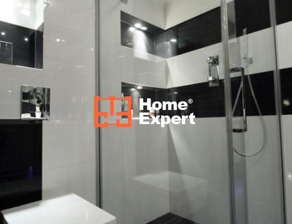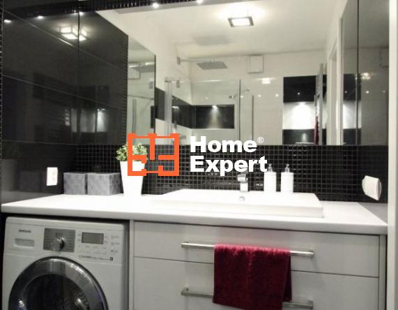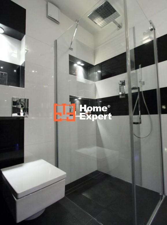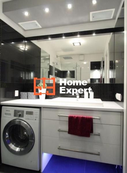 Włoskie płytki. Kabina prysznicowa Hüppe zamontowana na równi z podłogą (bez progów), odpływ liniowy Kessel. Pralko-suszarka Samsung 8kg, wbudowane głośniki w sufit. W grzejniku łazienkowym wbudowana grzałka elektryczna (możliwość dosuszania ręczników poza okresem grzewczym). Drzwi bezprzylgowe.