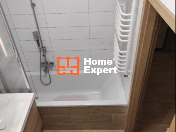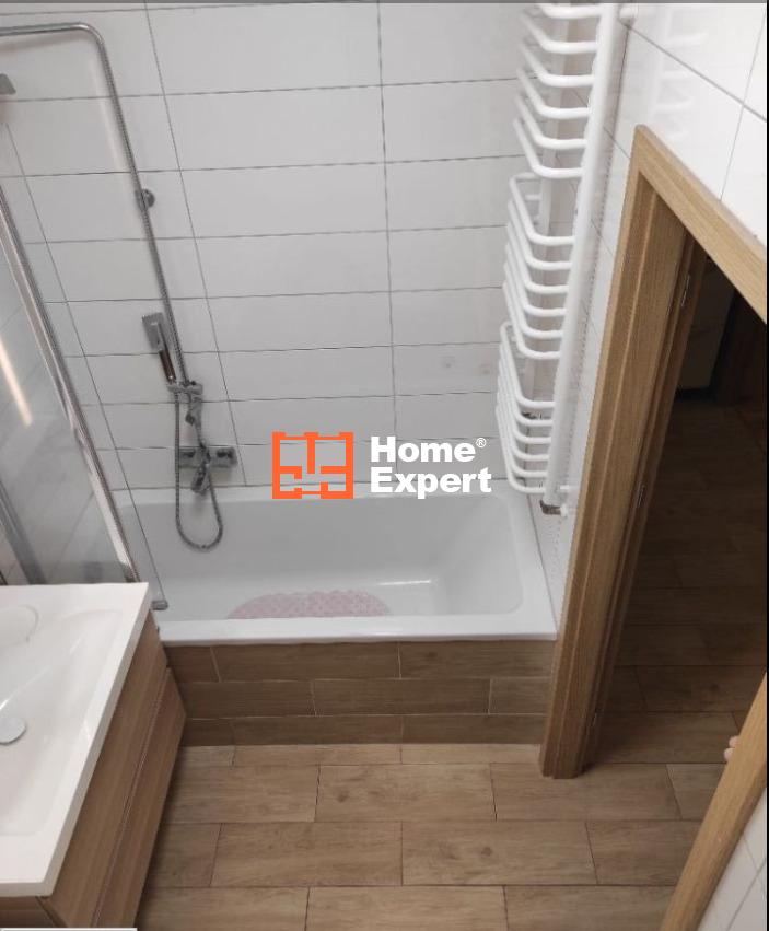 Łazienka z wanną, ze składanym parawanem dającym funkcję prysznica. Przestronna.