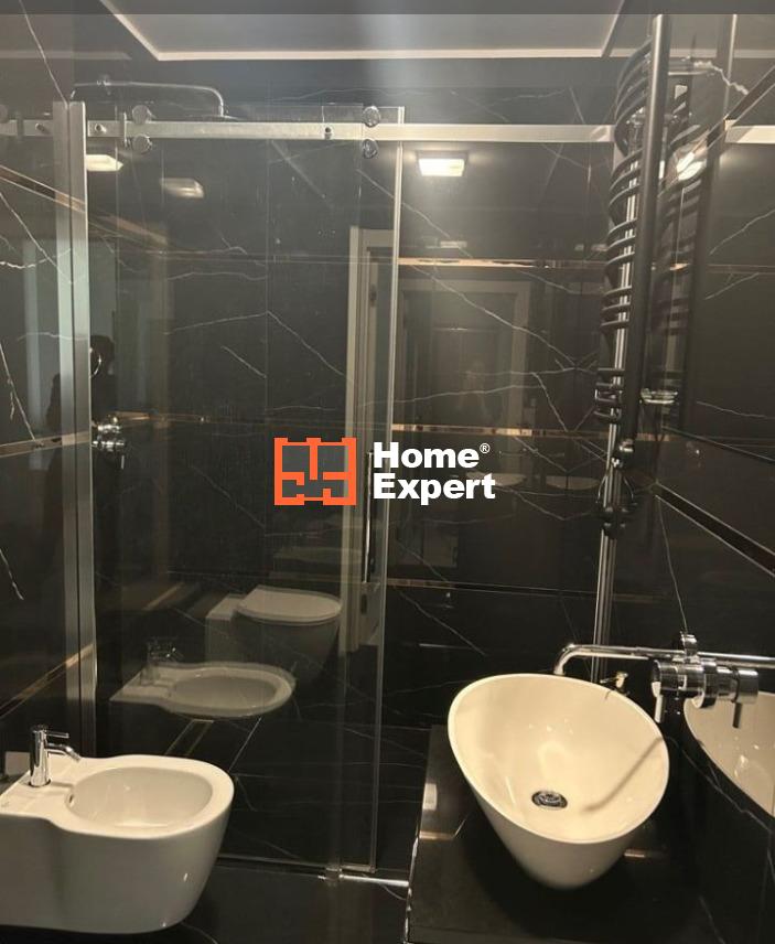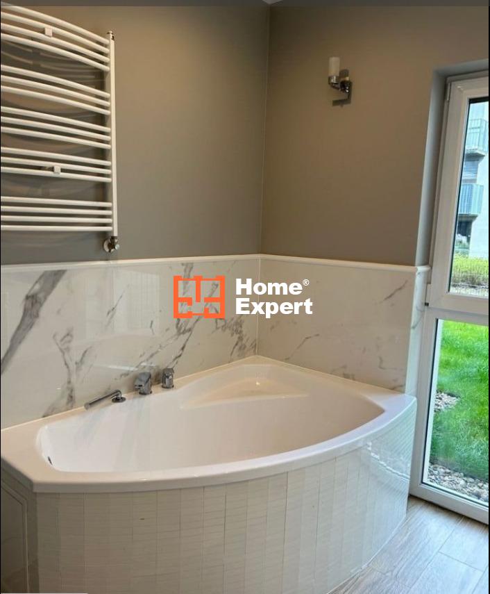 Mieszkanie wykończone z wysokiej jakości materiałów oraz mebli wykonanych na wymiar, drewniane podłogi, kamienne blaty w kuchni oraz łazience, kafle imitujące marmur w łazienkach oraz kuchni, mechaniczne rolety okienne, antywłamaniowe.