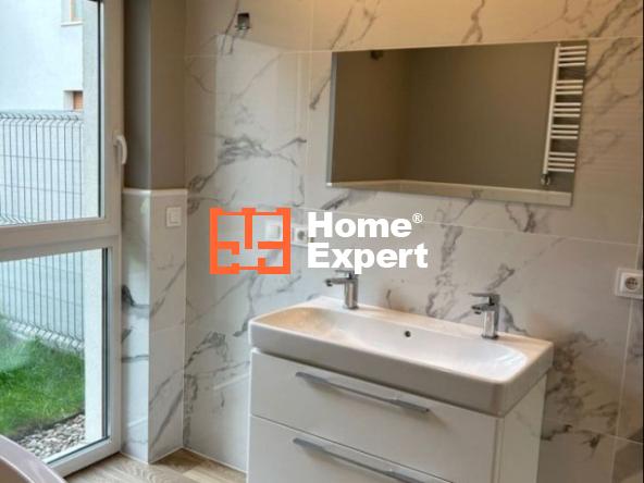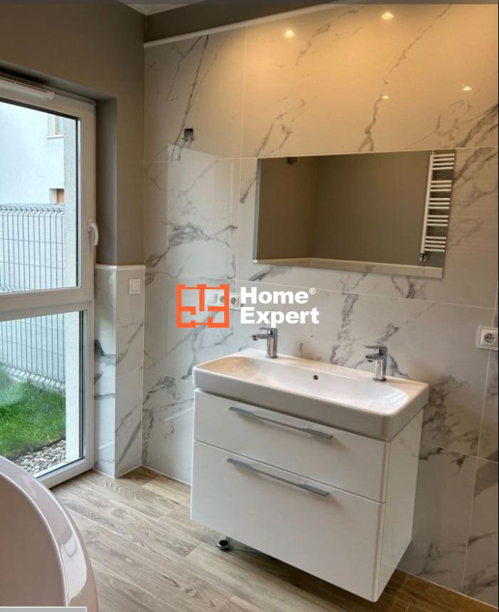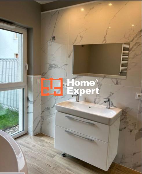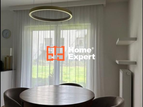 Duży salon z wyjściem na ogród oraz aneks kuchenny, przedpokój z szafą, druga łazienka oraz druga sypialnia.
