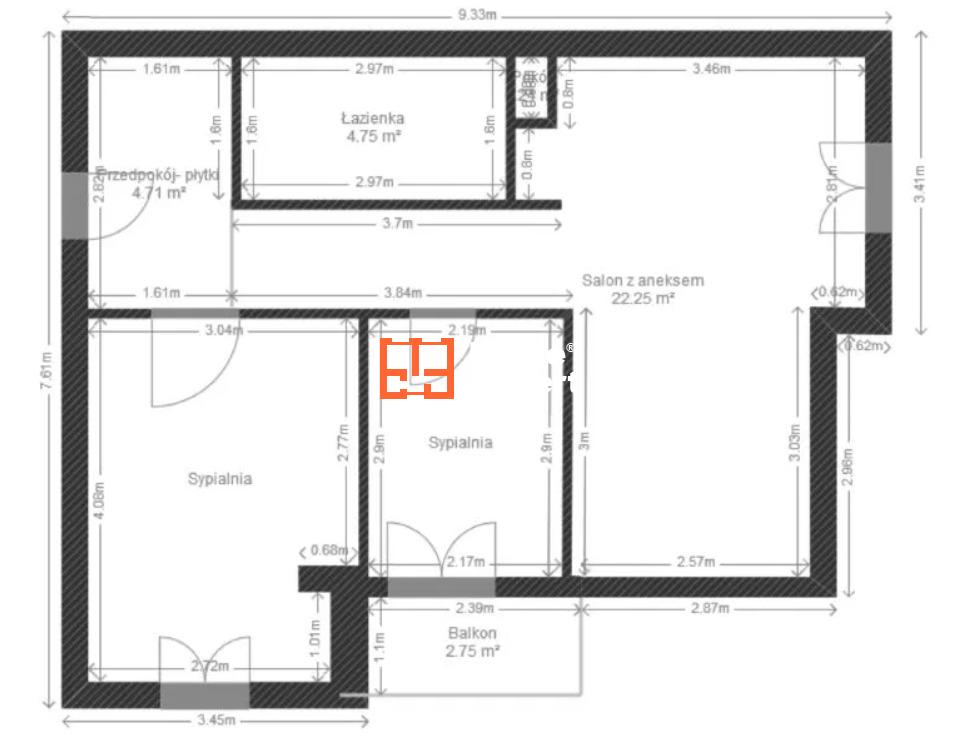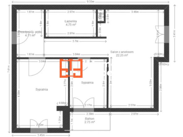 Powierzchnia mieszkania wynosi 50,76 m2 i obejmuje: