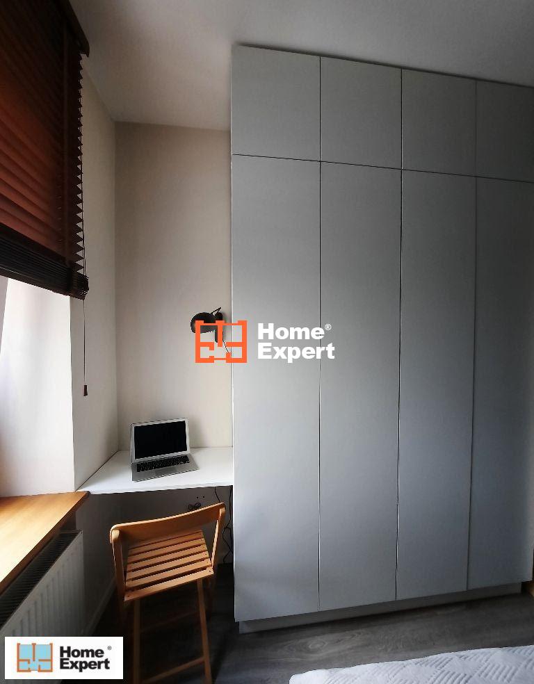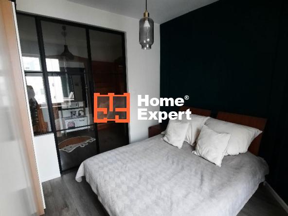 Lokal składa się z dwóch pokoi, w tym salonu oraz sypialni, która została funkcjonalnie podzielona szklaną loftową ścianą na część sypialnianą oraz przestrzeń, która idealnie nadaje się na biuro (i taki był pierwotny zamysł) lub pokoik dla dziecka.
