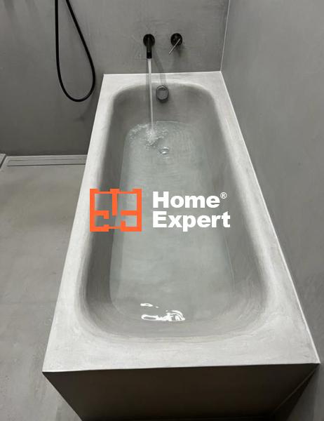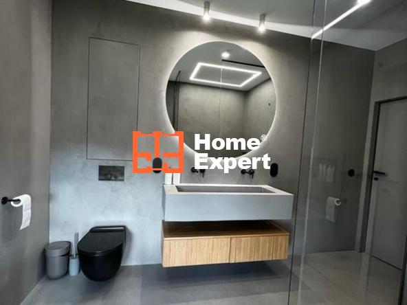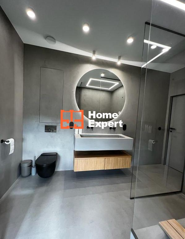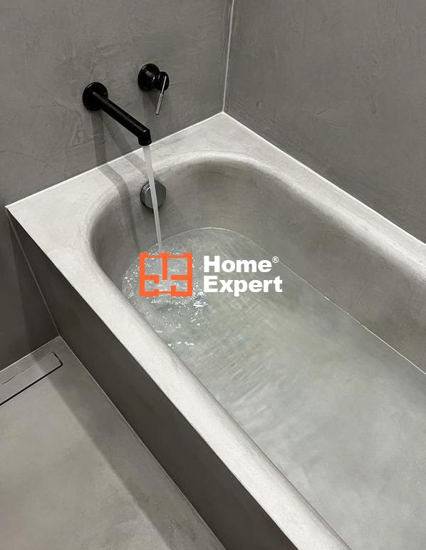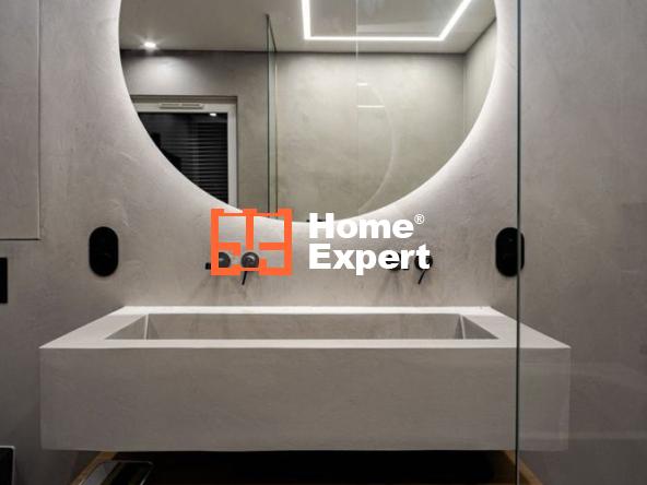 Przestronna łazienka urzeka eleganckimi detalami, takimi jak włoskie baterie GESSI, których wartość sięga około 60 000 złotych. Mikrocement na ścianach i posadzce dodaje niepowtarzalnego charakteru temu wyjątkowemu pomieszczeniu.