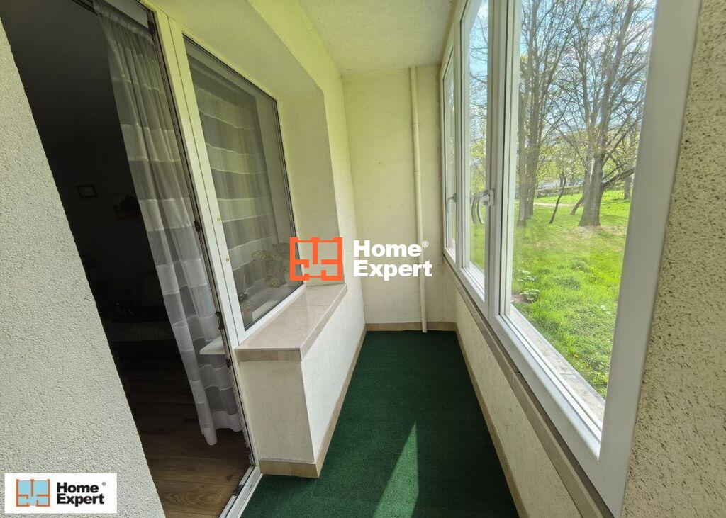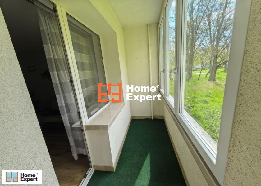 Mieszkanie na wysokim parterze z dużym zabudowanym oknami balkonem z doprowadzonym oświetleniem.