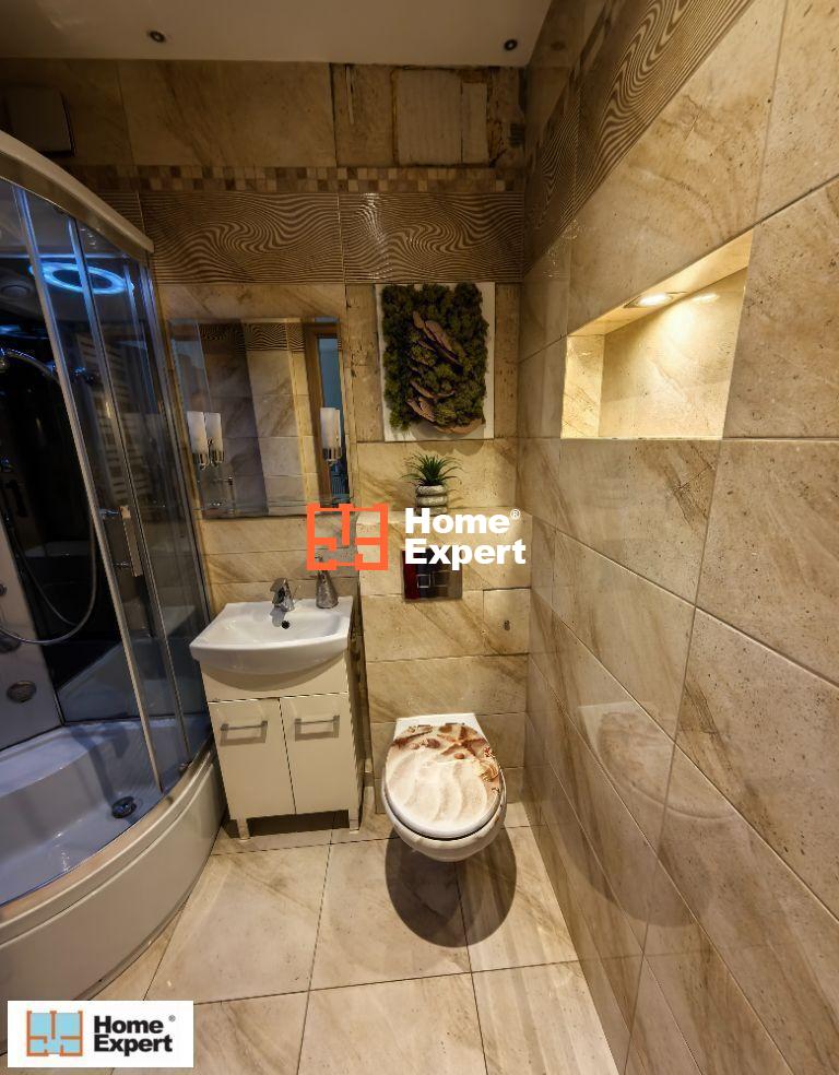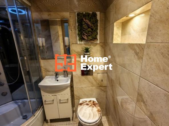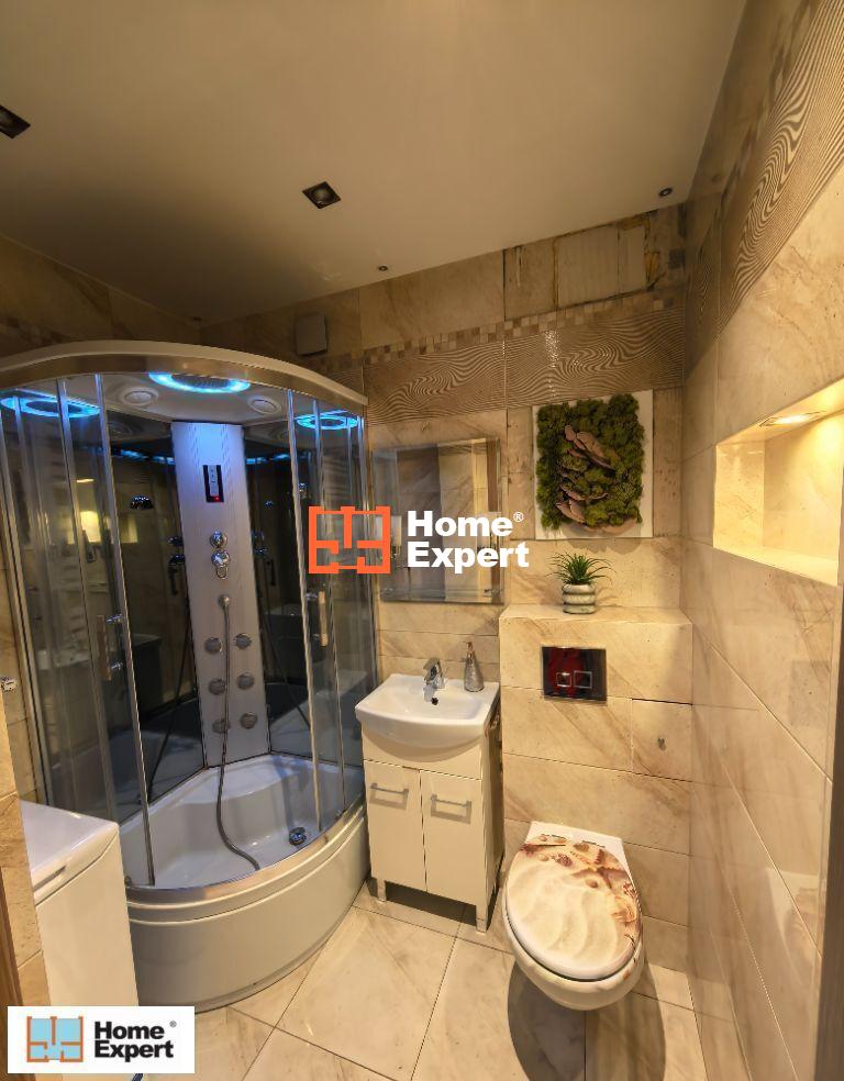Ładna łazienka z podświetlaną kabiną prysznicową z radiem i wentylacją.