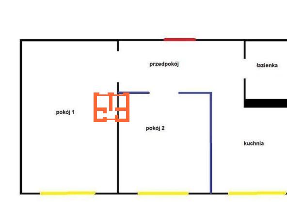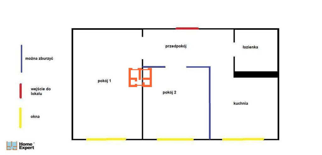 Na załączonym rzucie orientacyjnym, zaznaczone jest możliwe wyburzenie ściany pomiędzy mniejszym pokojem a kuchnią, dzięki czemu otrzymacie Państwo dużą przestrzeń, która może pełnić funkcję przestronnego pokoju dziennego z aneksem kuchennym.