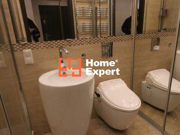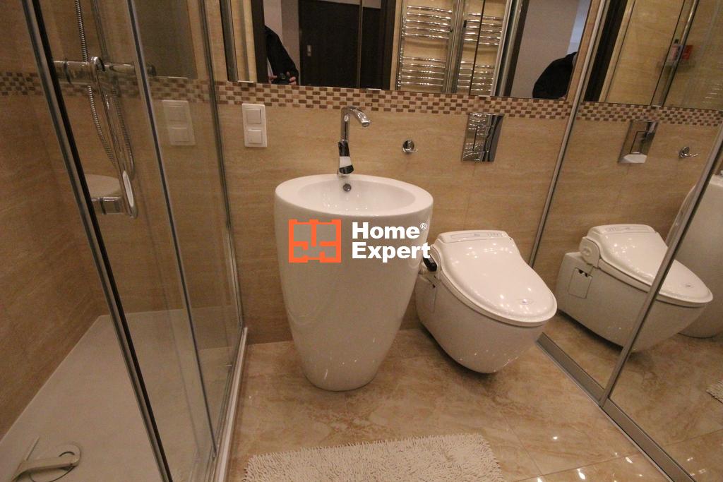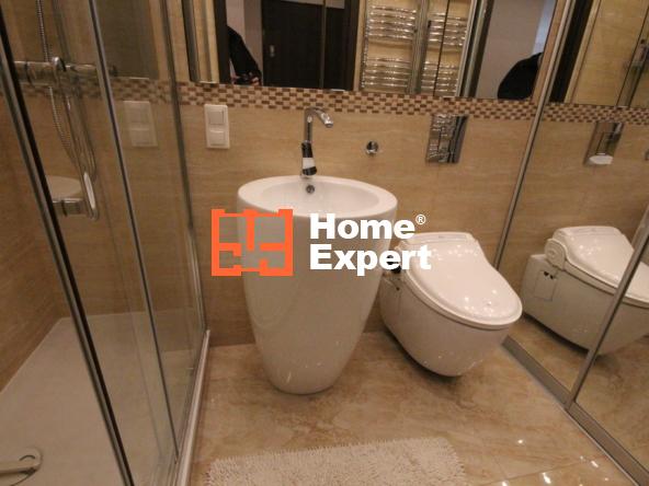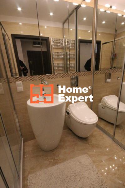 Łazienka: Wyposażona w wolnostojącą umywalkę, wc typu biobidet, dużą kabinę prysznicową z niskim brodzikiem, lustrzane szafki w zabudowie, pralkę oraz zabudowę.