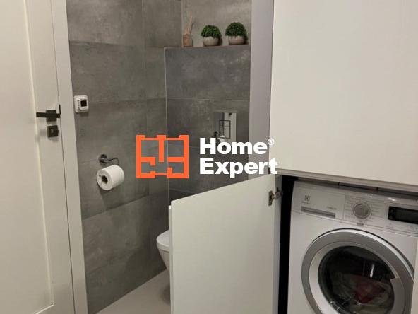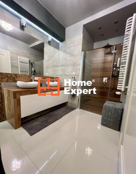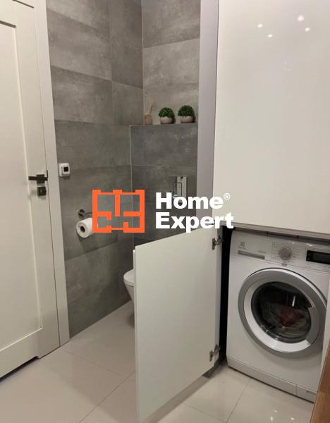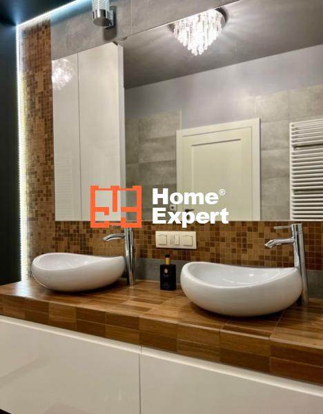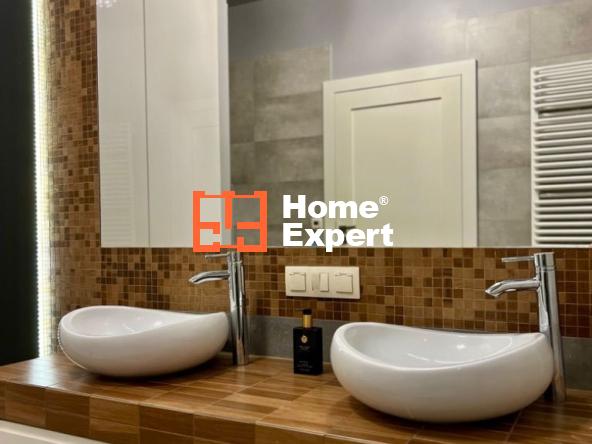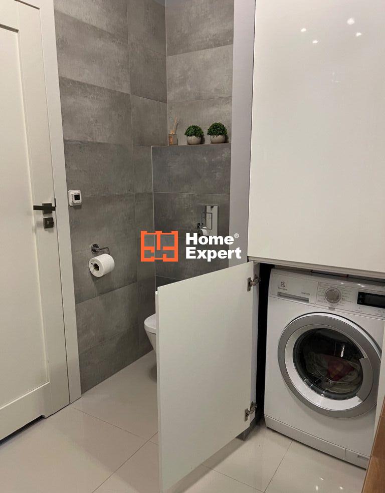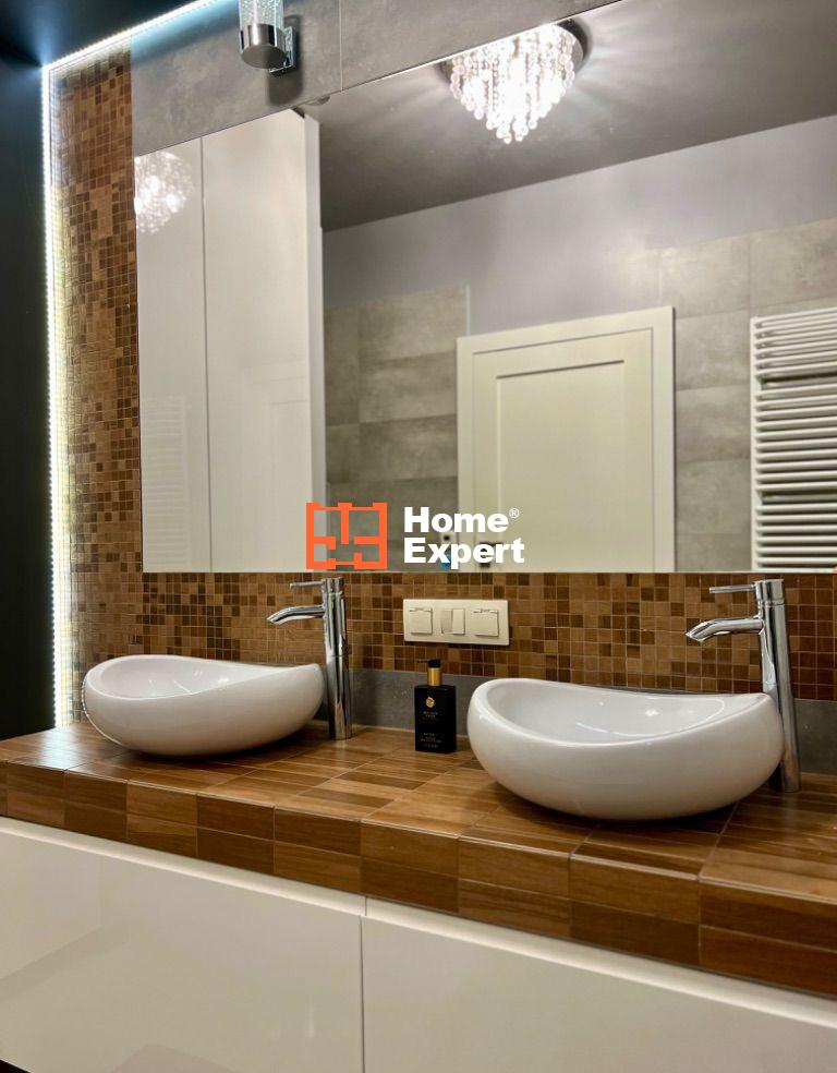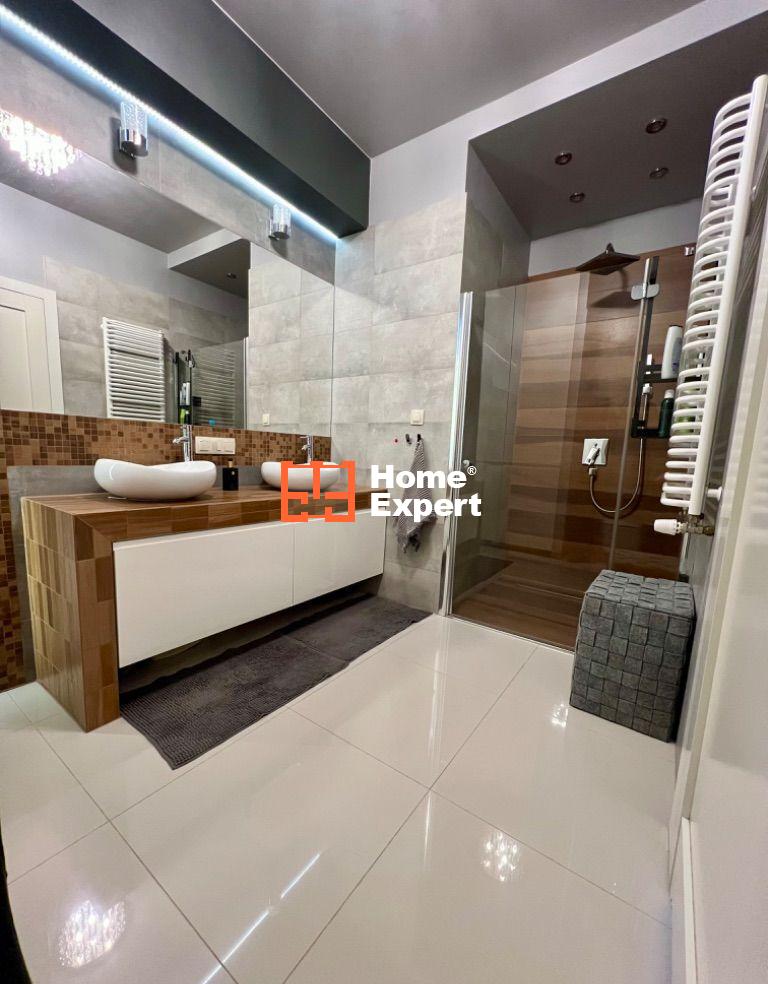 - Łazienka – duża, z kabiną prysznicową z deszczownicą, podwójną umywalką, WC, zabudowanym piecem oraz pralką. Klimatyczne oświetlenie ledowe.