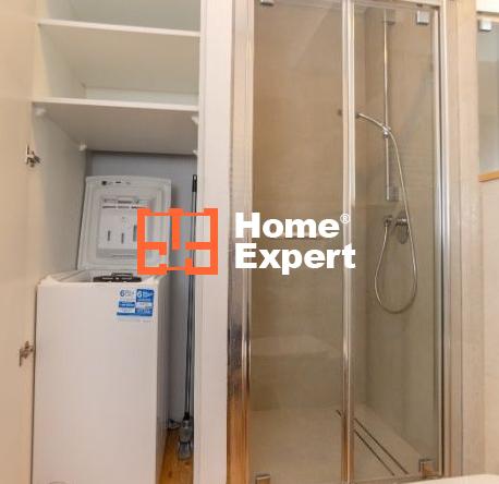 Łazienka z toaletą, kabiną prysznicową z baterią, kaloryferem, umywalką z baterią, suszarką na pranie, wiadrem i mopem.